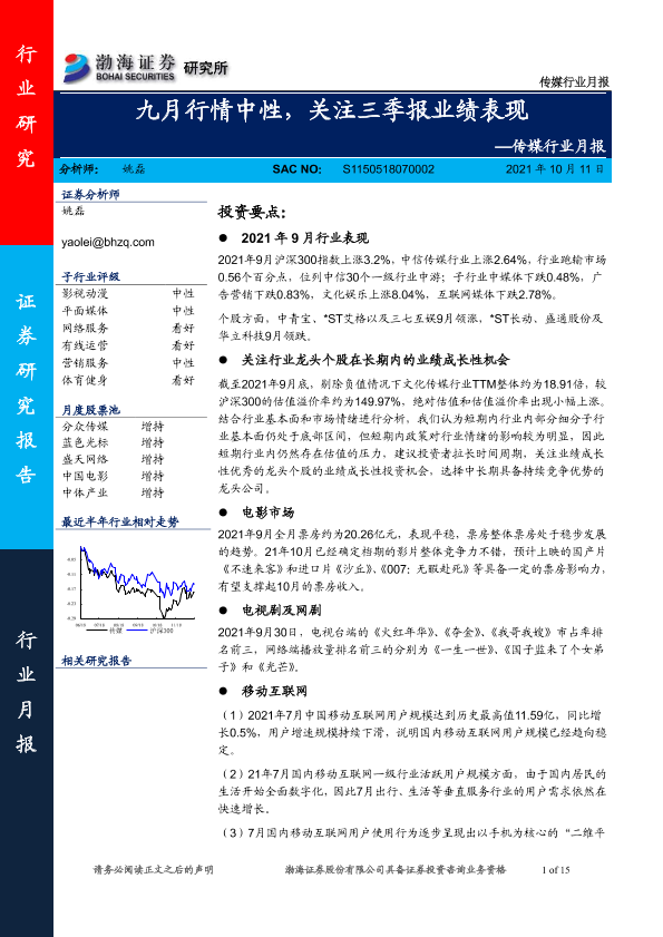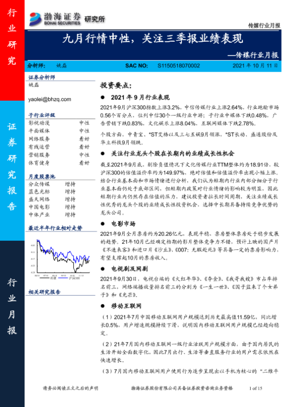 【渤海证券】【20211011】传媒行业月报:九月行情中性,关注三季报业绩表现-15页