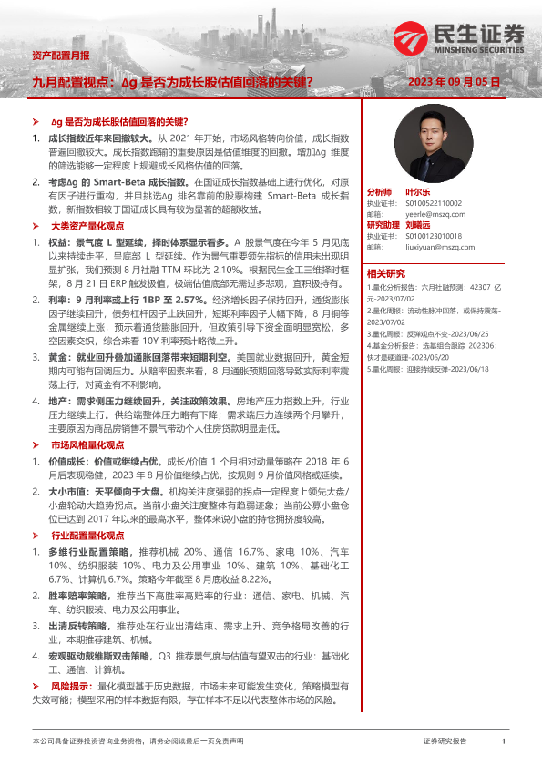 【民生证券】【20230905】资产配置月报:九月配置视点,Δg是否为成长股估值回落的关键?-33页