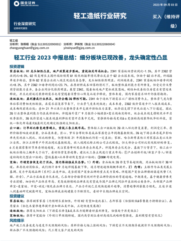 【国金证券】【20230903】轻工行业2023中报总结:细分板块已现改善,龙头确定性凸显-26页