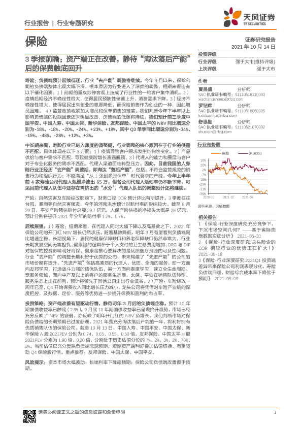 【天风证券】【20211014】保险行业3季报前瞻:资产端正在改善,静待“淘汰落后产能”后的保费触底回升-15页