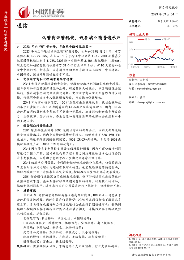 【国联证券】【20230904】通信行业:运营商经营稳健,设备端业绩普遍承压-25页