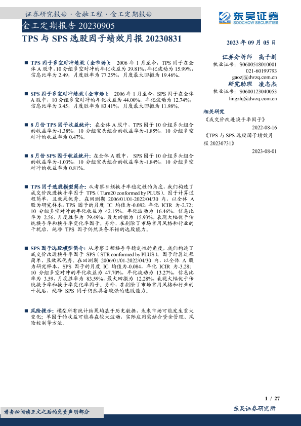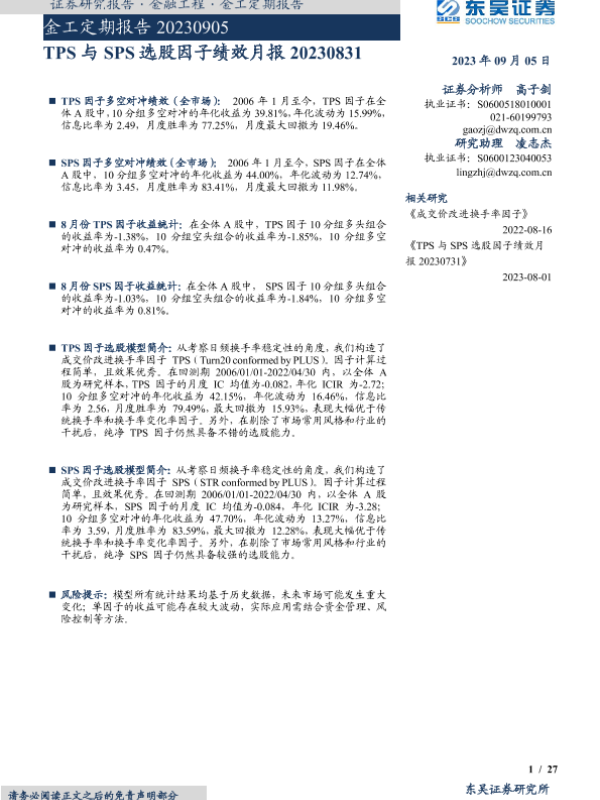 【东吴证券】【20230905】金工定期报告:TPS与SPS选股因子绩效月报-27页