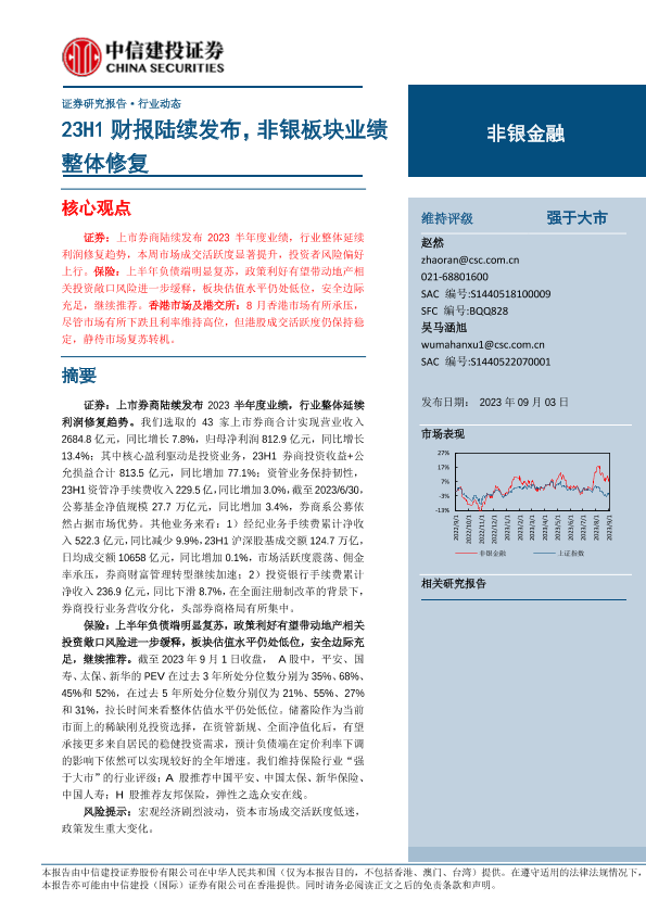 23H1财报 业绩修复 保险行业 证券行业 非银金融
