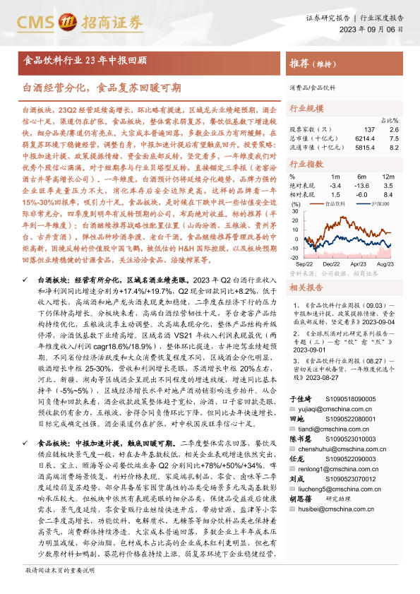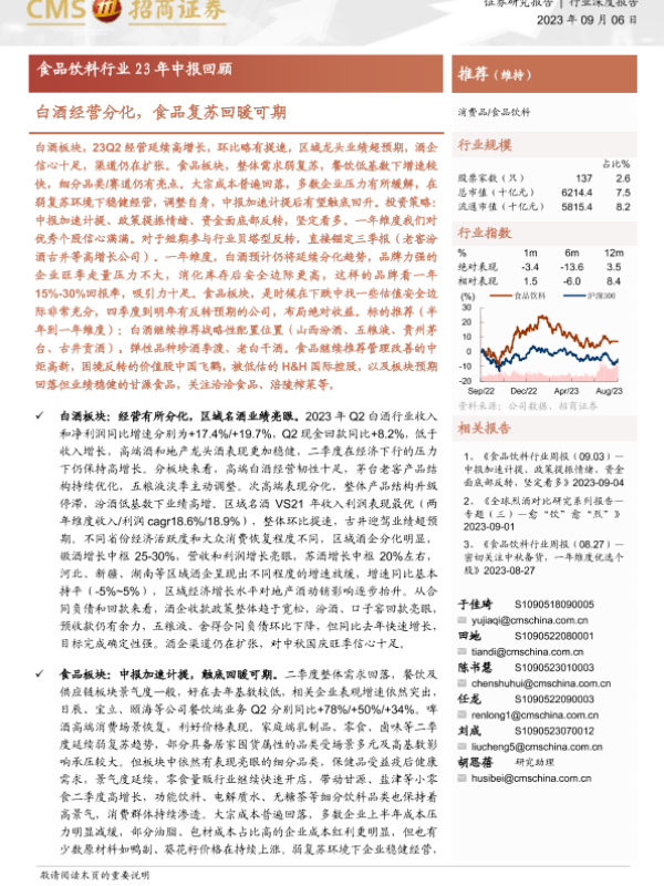 【海通证券】【20230906】食品饮料行业23年中报回顾:白酒经营分化,食品复苏回暖可期-23页