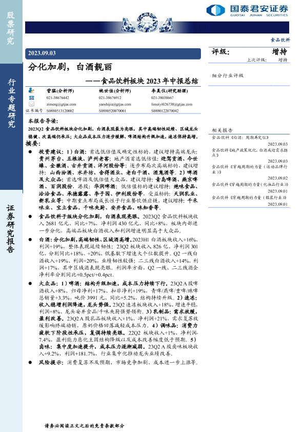 【国泰君安证券】【20230903】食品饮料行业板块2023年中报总结:分化加剧,白酒靓丽-41页