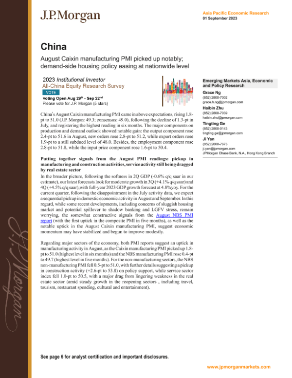【J.P. Morgan】【20230901】中国8月财新制造业PMI显著回升;全国范围内的住房需求侧政策放松-10页