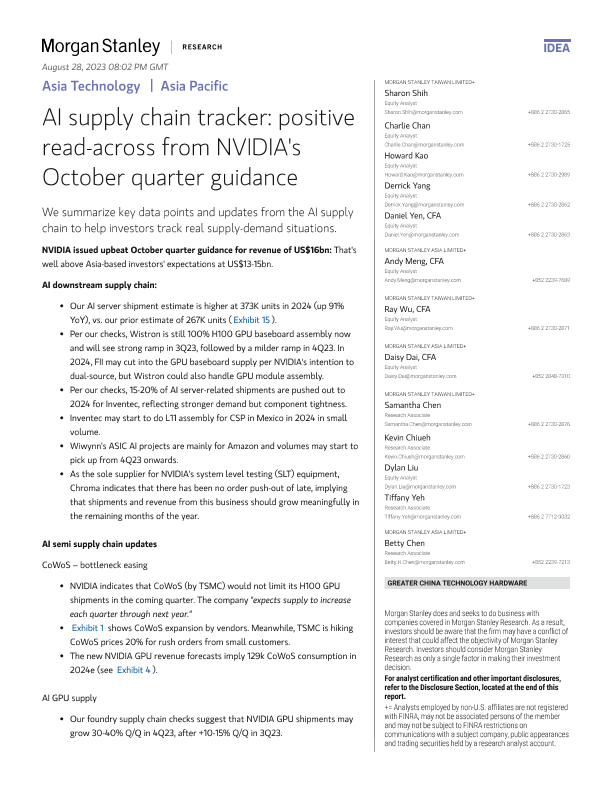 【Morgan Stanley】【20231001】Asia Technology AI supply chain tracker positive read-across from NVIDIA's October quarter guidance-25页