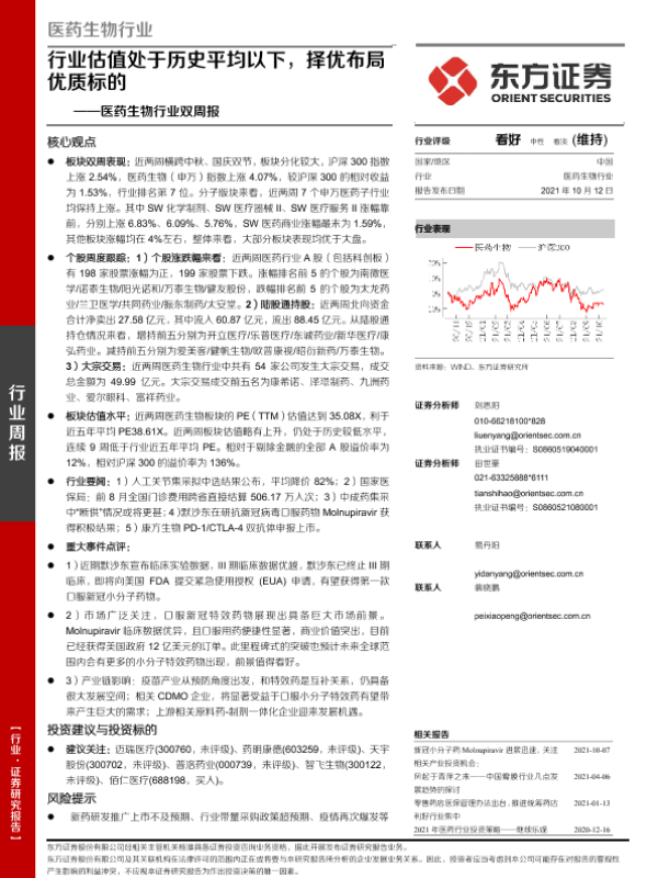 【东方证券】【20211012】医药生物行业双周报:行业估值处于历史平均以下,择优布局优质标的-19页