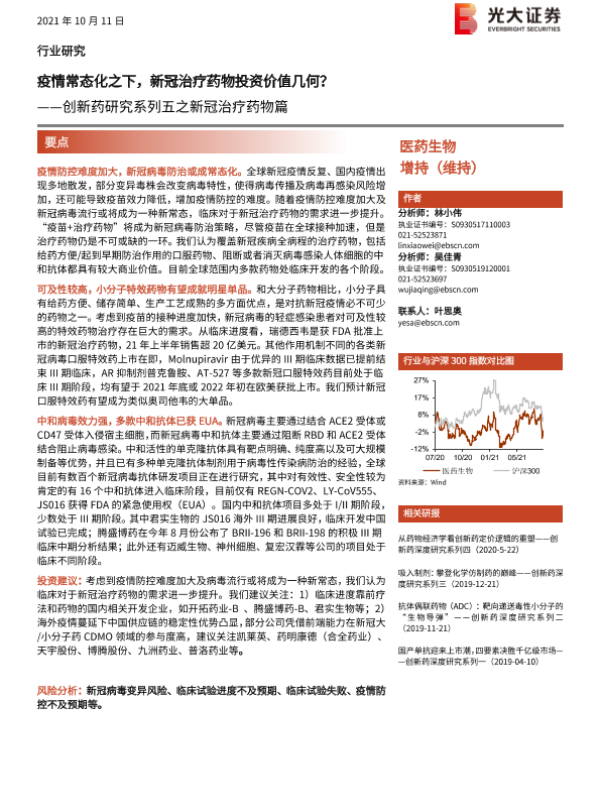 【光大证券】【20211011】医药生物行业创新药研究系列五之新冠治疗药物篇:疫情常态化之下,新冠治疗药物投资价值几何?-30页