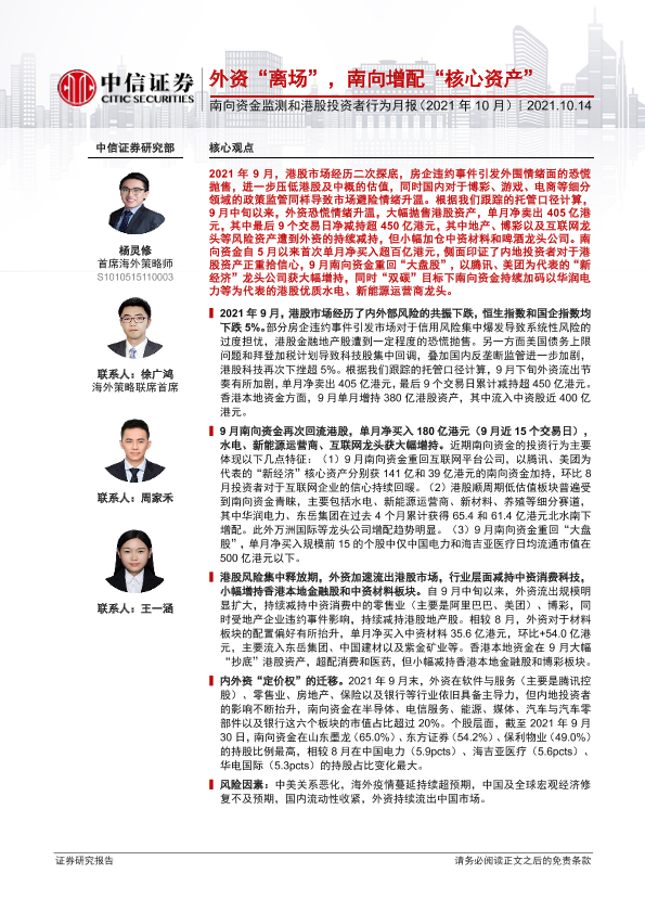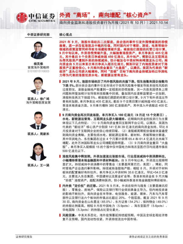【中信证券】【20211014】南向资金监测和港股投资者行为月报(2021年10月):外资“离场”,南向增配“核心资产”-17页