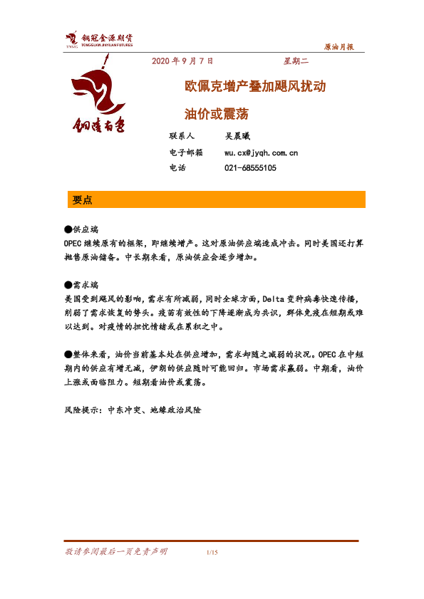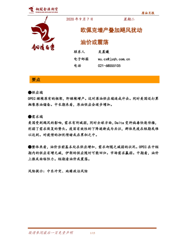 【铜冠金源期货】【20210907】原油月报:欧佩克增产叠加飓风扰动,油价或震荡-15页