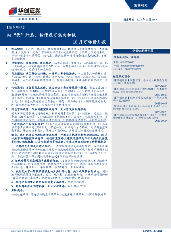 【华创证券】【20231009】10月可转债月报:内“优”外患,转债或可偏向积极-23页
