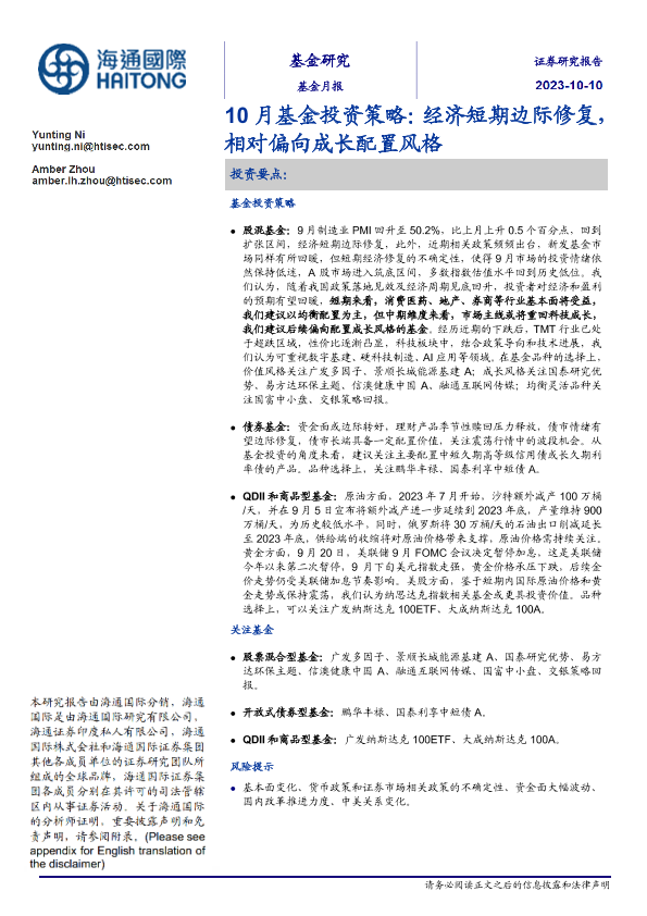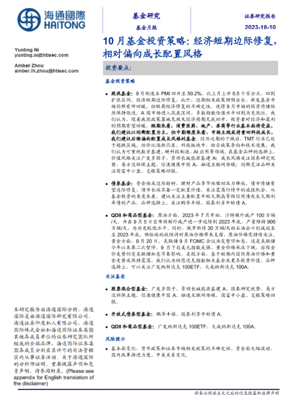 【海通国际】【20231010】10月基金投资策略:经济短期边际修复,相对偏向成长配置风格-20页