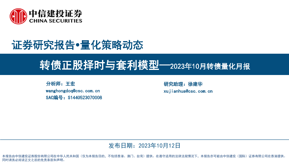 【中信建投证券】【20231012】2023年10月转债量化月报:转债正股择时与套利模型-39页
