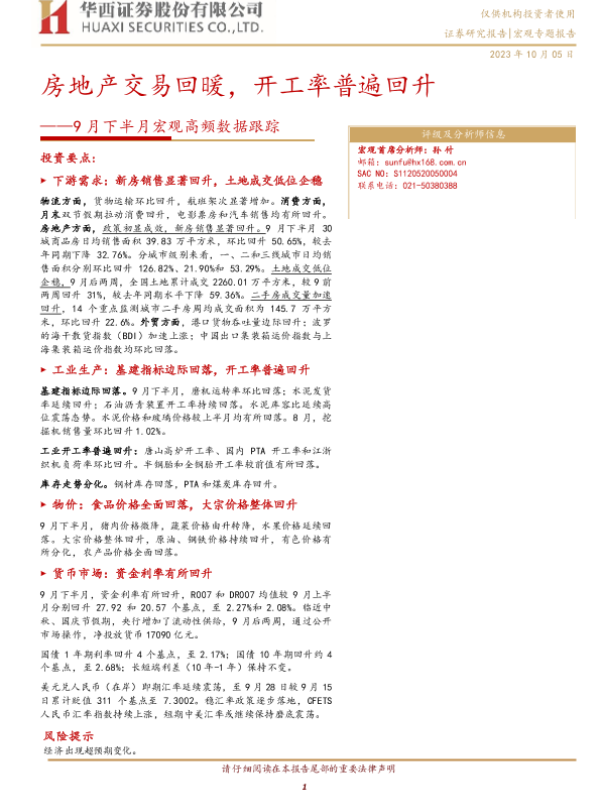 【华西证券】【20231005】9月下半月宏观高频数据跟踪:房地产交易回暖,开工率普遍回升-17页