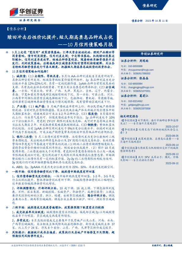 【华创证券】【20231011】10月信用债策略月报:赎回冲击后性价比提升,短久期高票息品种或占优-30页