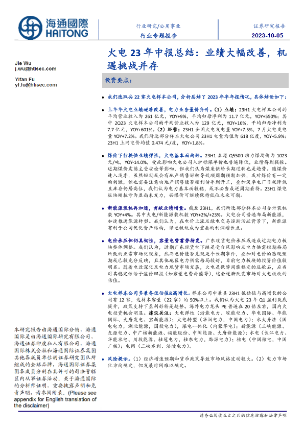 【海通国际】【20231005】公用事业行业专题报告:火电23年中报总结,业绩大幅改善,机遇挑战并存-22页