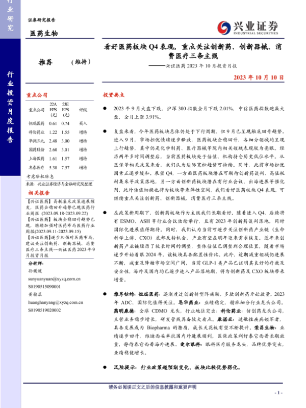 【兴业证券】【20231010】医药行业2023年10月投资月报:看好医药板块Q4表现,重点关注创新药、创新器械、消费医疗三条主线-24页