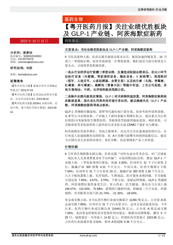 【粤开证券】【20231011】医药行业月报:关注业绩优胜板块及GLP_1产业链、阿茨海默症新药-23页