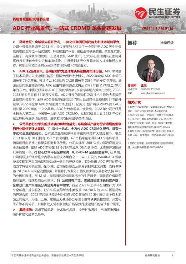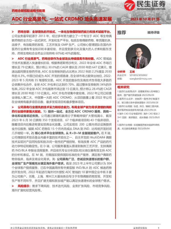 【民生证券】【20231001】医药行业药明合联招股说明书梳理:ADC行业高景气,一站式CRDMO龙头高速发展-27页