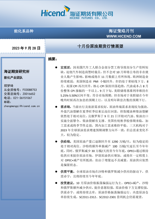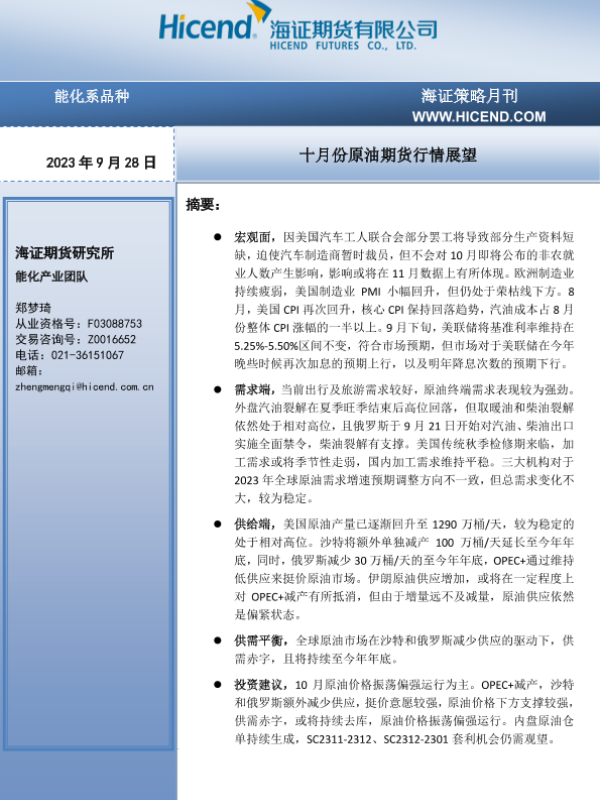 【海证期货】【20230928】十月份原油期货行情展望-26页
