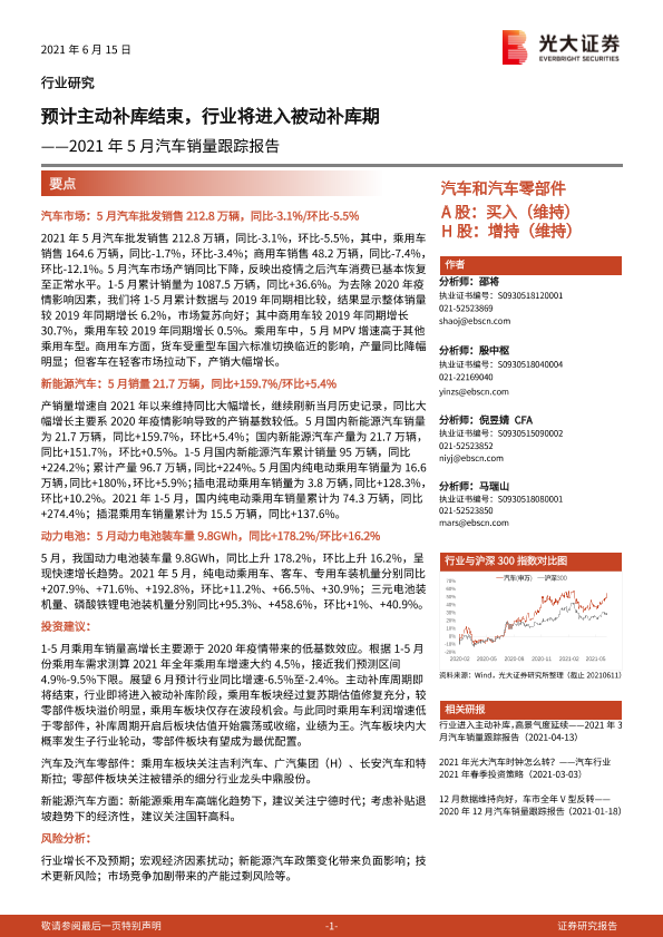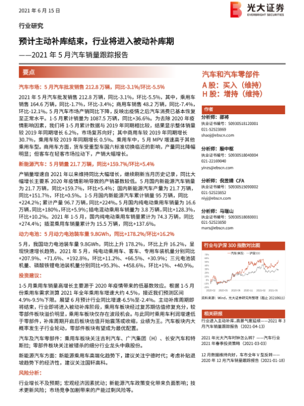 【光大证券】【20210615】汽车和汽车零部件行业2021年5月汽车销量跟踪报告:预计主动补库结束,行业将进入被动补库期-18页