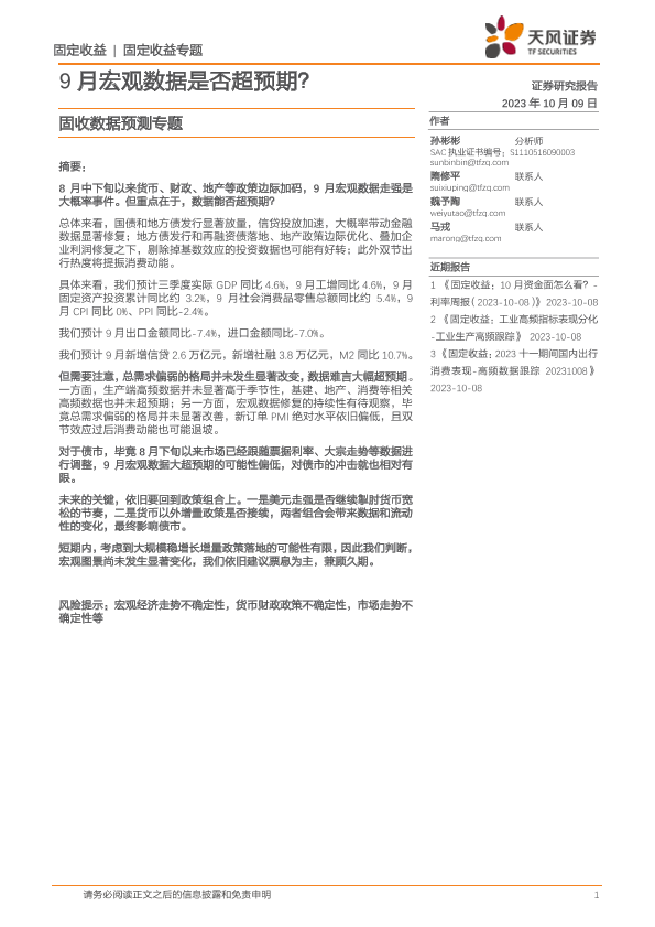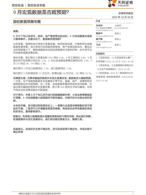 【天风证券】【20231009】固收数据预测专题:9月宏观数据是否超预期?-21页