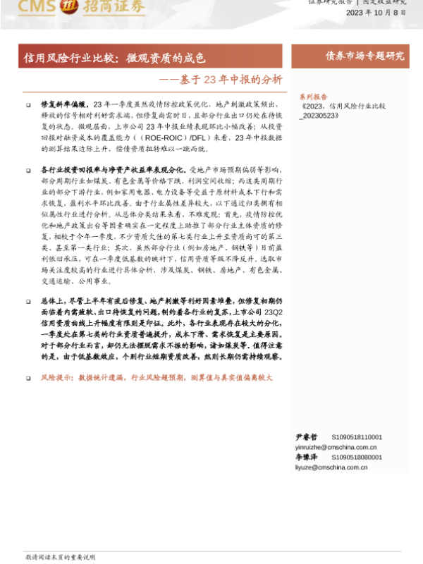 【海通证券】【20231008】基于23年中报的分析:信用风险行业比较,微观资质的成色-21页