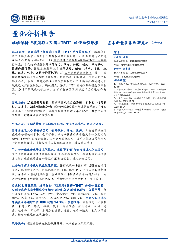 【国盛证券】【20231011】基本面量化系列研究之二十四:继续保持“顺周期+医药+TMT”的哑铃型配置-21页