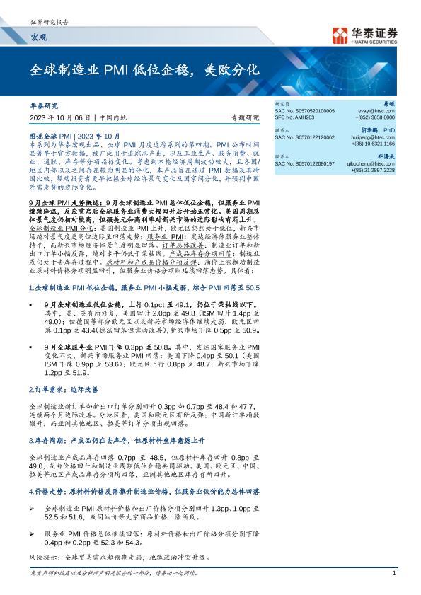 【华泰证券】【20231006】宏观专题研究:全球制造业PMI低位企稳,美欧分化-18页