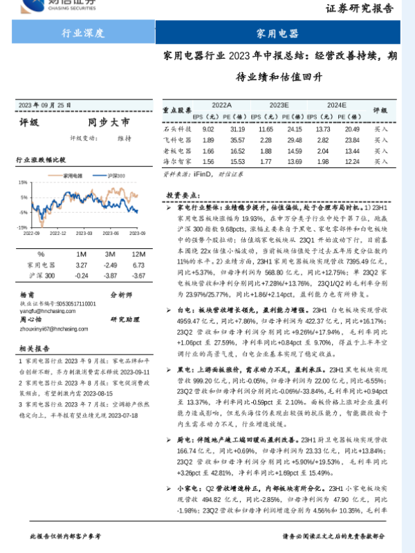 【财信证券】【20230925】家用电器行业2023年中报总结:经营改善持续,期待业绩和估值回升-19页