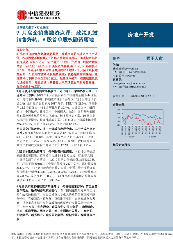 【中信建投证券】【20231013】房地产开发行业9月房企销售融资点评:政策见效销售好转,A股首单股权融资落地-24页