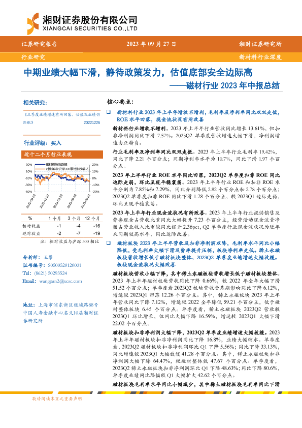 【湘财证券】【20230927】新材料行业深度:磁材行业2023年中报总结,中期业绩大幅下滑,静待政策发力,估值底部安全边际高-20页