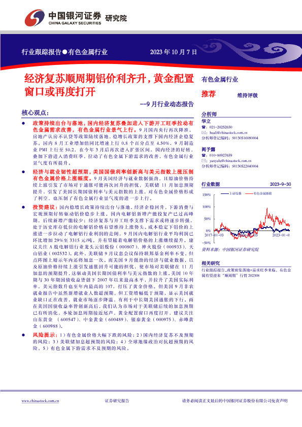 【银河证券】【20231007】有色金属行业9月行业动态报告:经济复苏顺周期铝价利齐升,黄金配置窗口或再度打开-26页