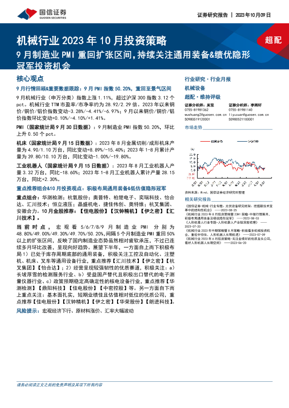 【国信证券】【20231009】机械行业2023年10月投资策略:9月制造业PMI重回扩张区间,持续关注通用装备&绩优隐形冠军投资机会-23页