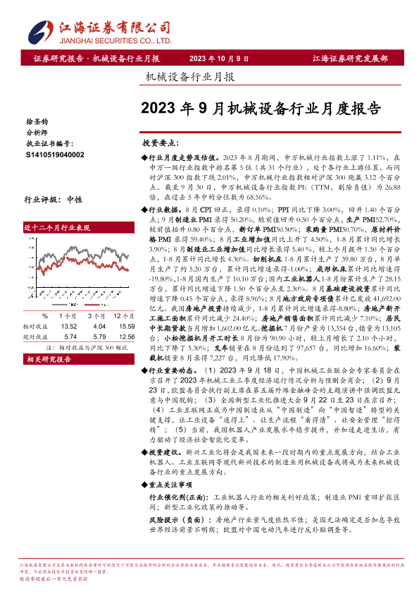 投资要点 月度分析 机械设备 江海证券 行业报告
