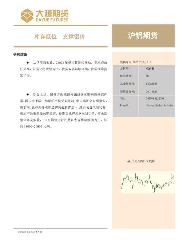 【大越期货】【20231009】沪铝期货月度报告:库存低位,支撑铝价-20页