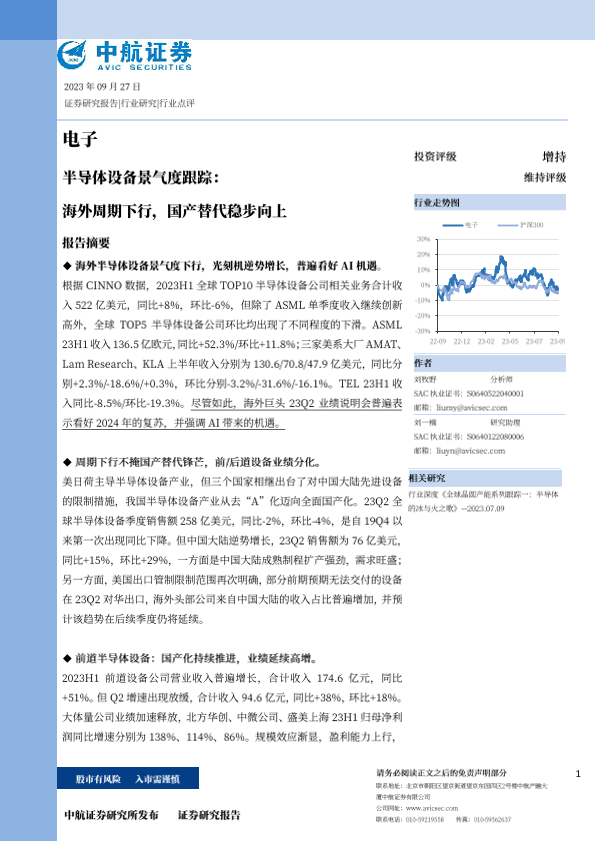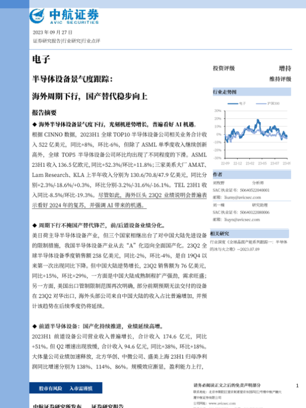 【中航证券】【20230927】电子行业半导体设备景气度跟踪:海外周期下行,国产替代稳步向上-17页
