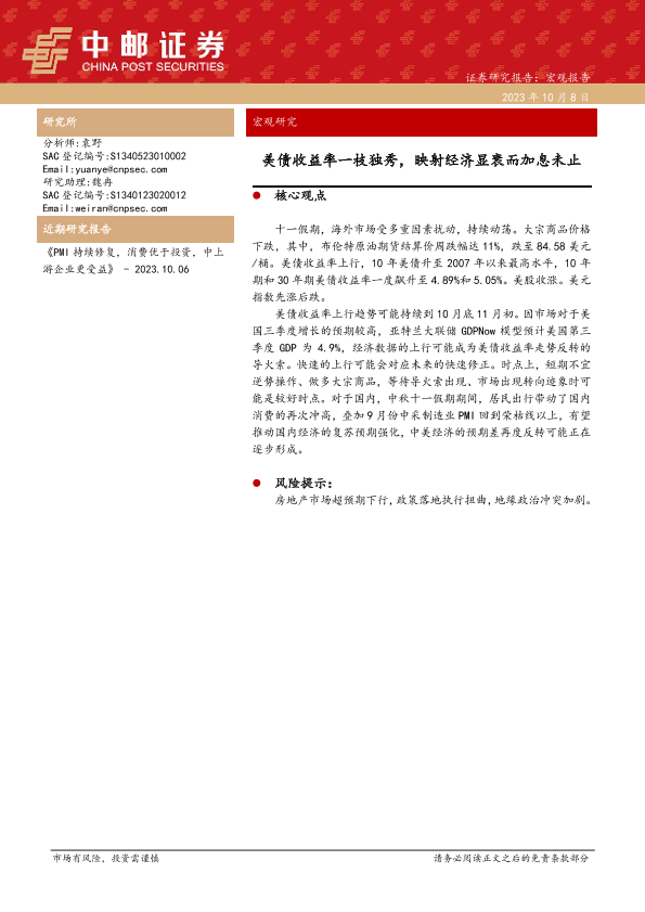 【中邮证券】【20231008】美债收益率一枝独秀,映射经济显衰而加息未止-32页