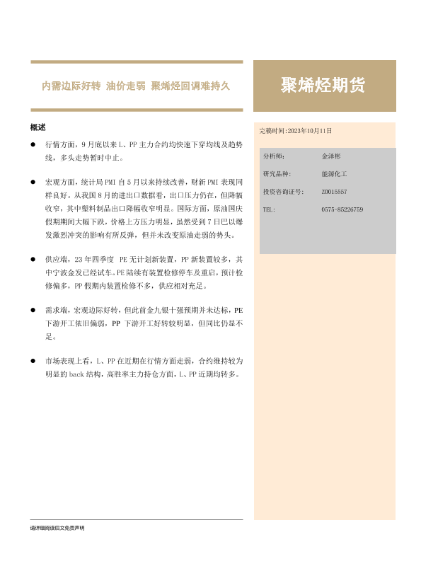 【大越期货】【20231011】聚烯烃期货:内需边际好转,油价走弱,聚烯烃回调难持久-21页