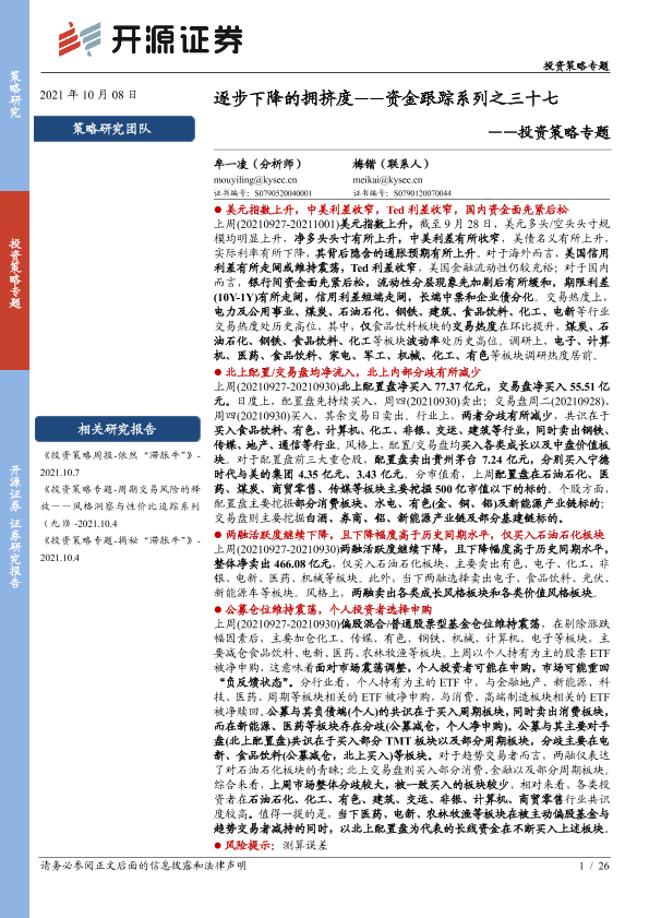 【开源证券】【20211008】投资策略专题:资金跟踪系列之三十七,逐步下降的拥挤度-26页