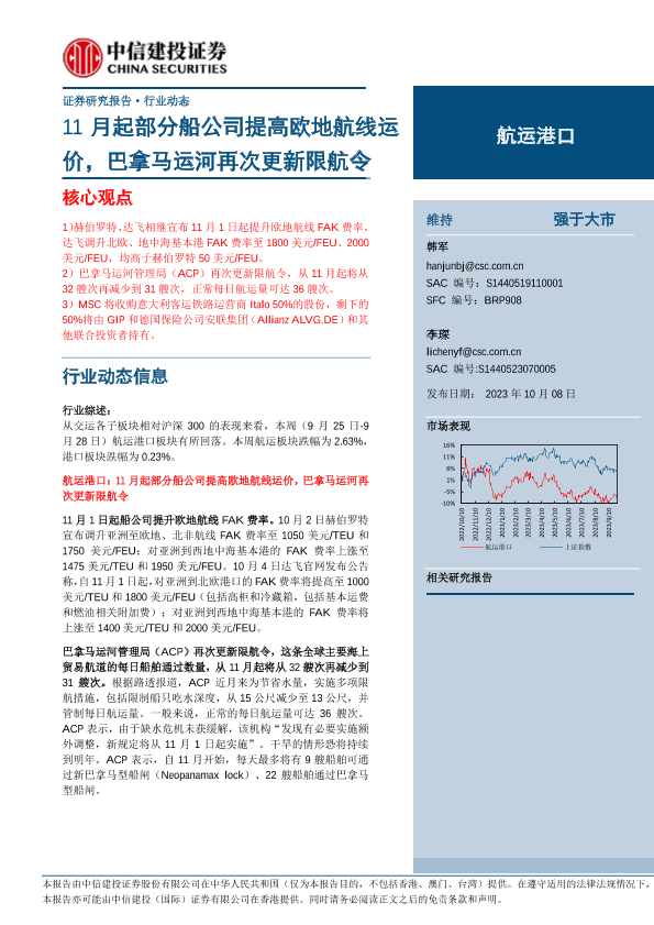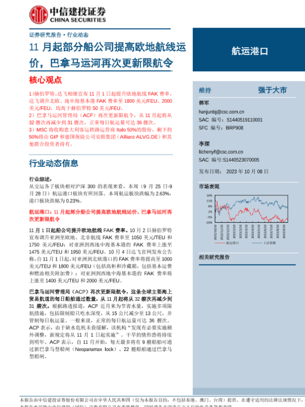 【中信建投证券】【20231008】航运港口行业:11月起部分船公司提高欧地航线运价,巴拿马运河再次更新限航令-26页