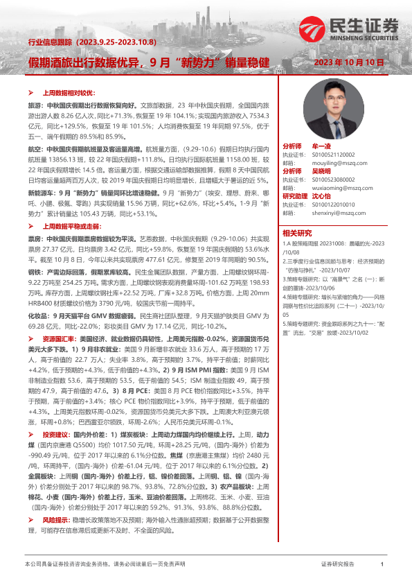 【民生证券】【20231010】行业信息跟踪:假期酒旅出行数据优异,9月“新势力”销量稳健-30页