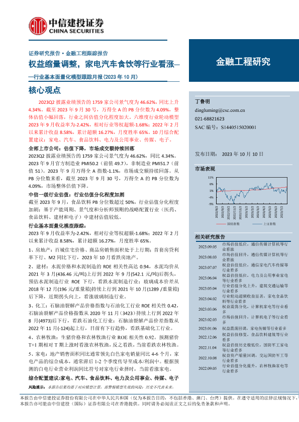 【中信建投证券】【20231010】行业基本面量化模型跟踪月报(2023年10月):权益缩量调整,家电汽车食饮等行业看涨-21页