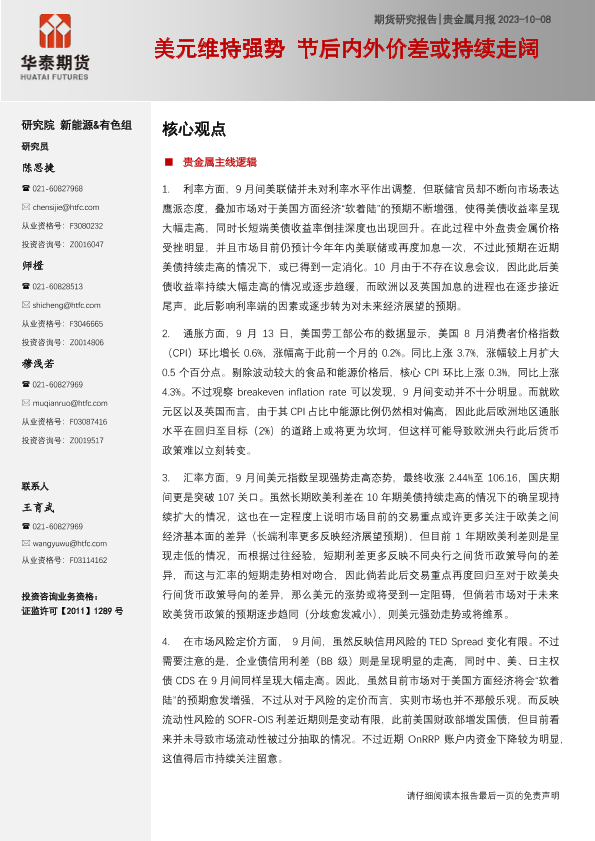 【华泰期货】【20231008】贵金属月报:美元维持强势,节后内外价差或持续走阔-21页