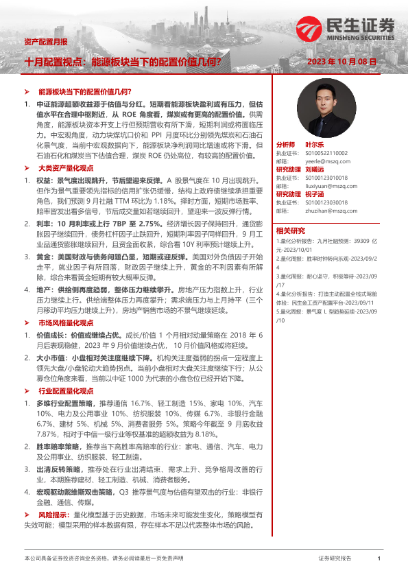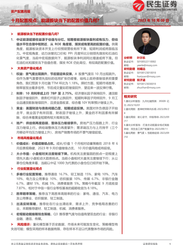 【民生证券】【20231008】资产配置月报:十月配置视点,能源板块当下的配置价值几何?-34页