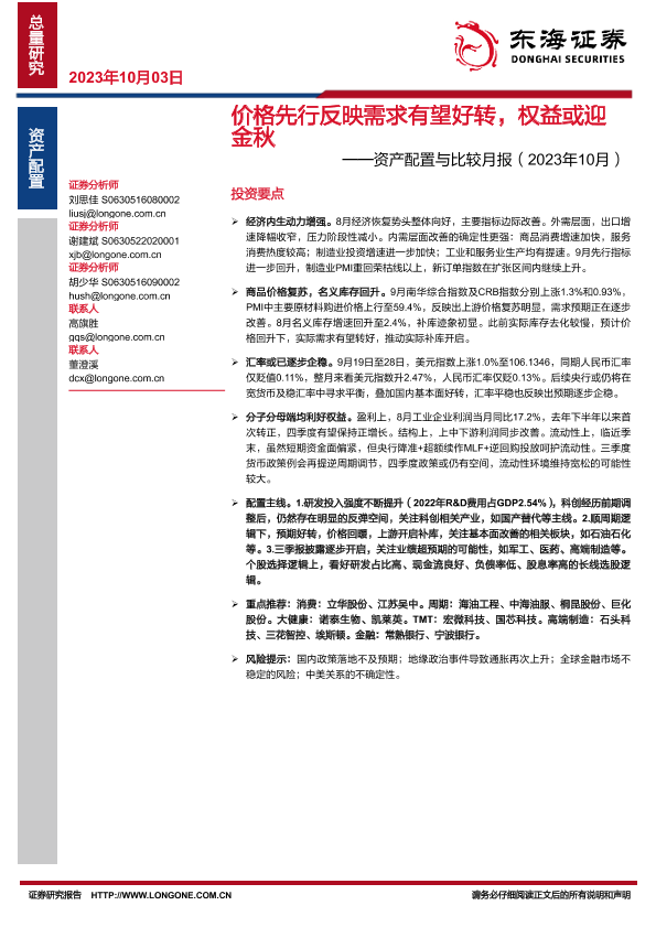 【东海证券】【20231003】资产配置与比较月报(2023年10月):价格先行反映需求有望好转,权益或迎金秋-26页
