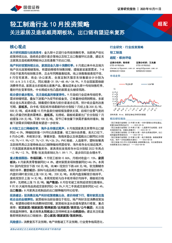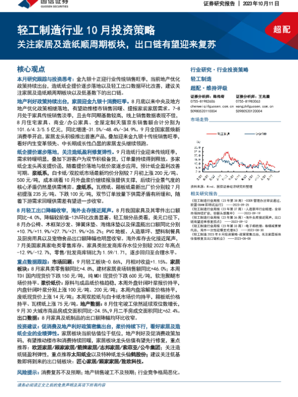 【国信证券】【20231011】轻工制造行业10月投资策略:关注家居及造纸顺周期板块,出口链有望迎来复苏-23页