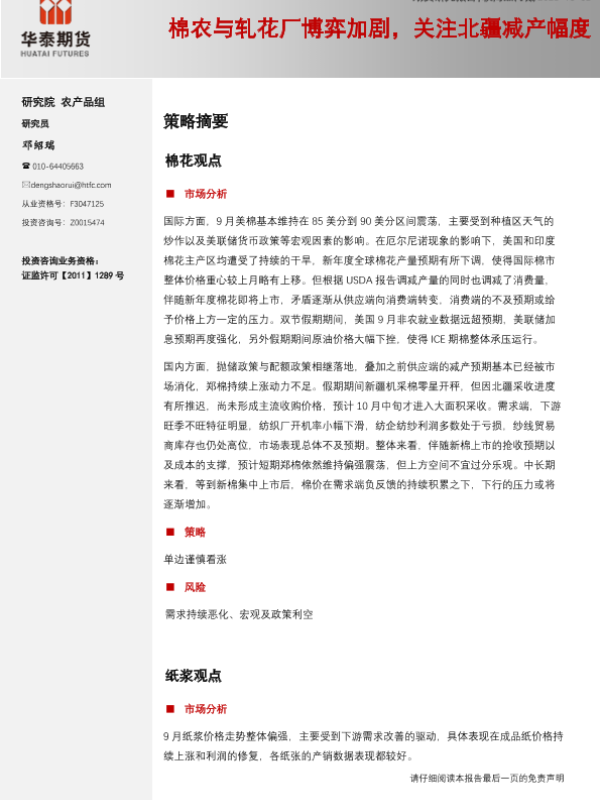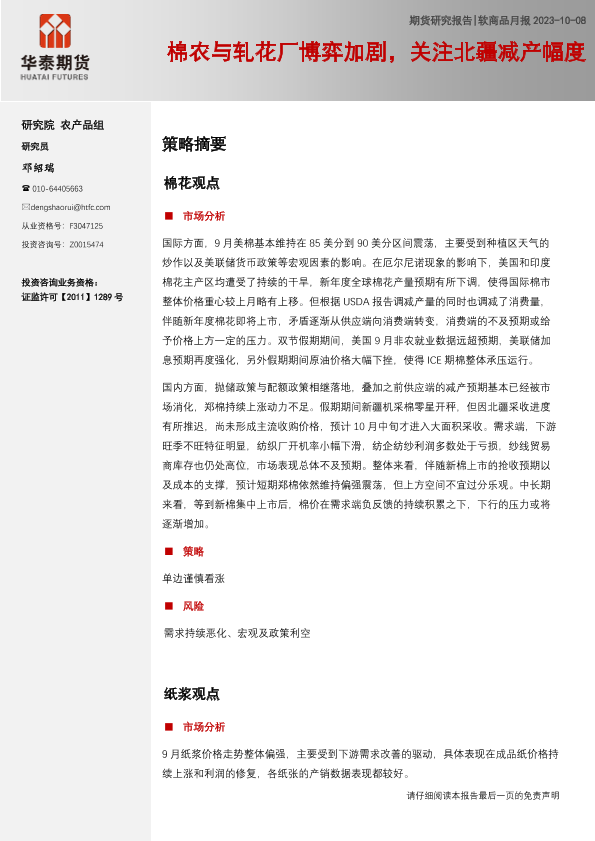 【华泰期货】【20231008】软商品月报:棉农与轧花厂博弈加剧,关注北疆减产幅度-20页