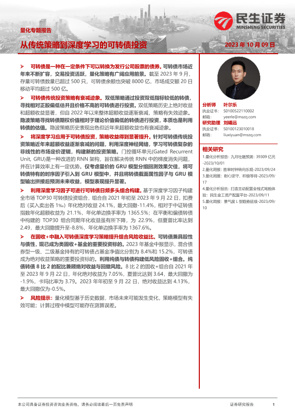 【民生证券】【20231009】量化专题报告:从传统策略到深度学习的可转债投资-23页